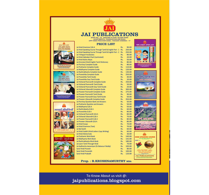 We JAI PUBLICATIONS have been serving the needs for books from Schools, Colleges, Children and also readers of all ages with our base at Chennai since 1992.