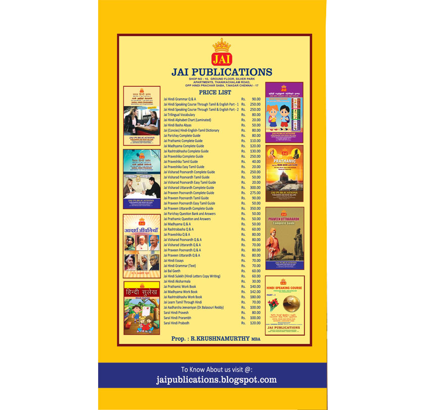 We  JAI PUBLICATIONS  have been serving the needs for books from Schools, Colleges, Children and also readers of all ages with our base at Chennai since 1992.